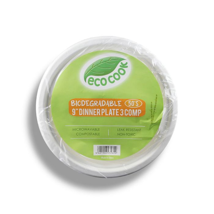 EcoCook 9" Biodegradable 3 Compartment Dinner Plates, 50 Pieces Pack x 10 Packs Carton