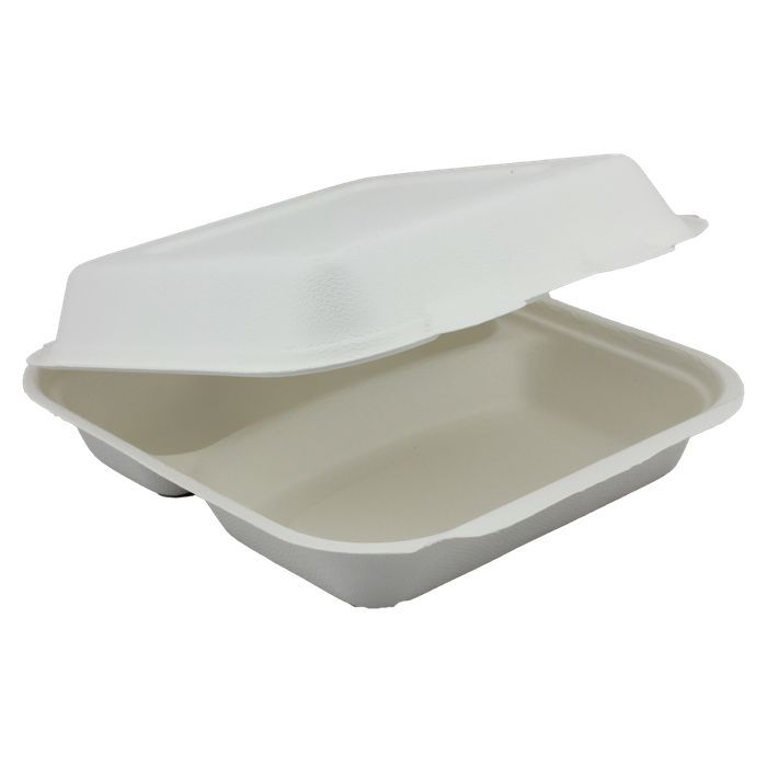Ecocook Sugarcane Container Hinged Lid 3 Compartment ,8x8 inch, 50 Pieces Pack x 5 Packs Carton